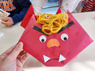 ・画用紙を折り上げるときの左右のバランスが難しそうだったが、お面を作った後「鬼は外」ができて楽しそうだった。