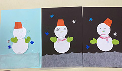 ・雪に見立てた綿を貼るために、大量の糊を容器から取るのに戸惑っていました。小さい雪の結晶も糊のスペースが小さいにもかかわらず上手に貼れました。